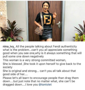 Big Brother Naija finalist, Nina took to her social media account to blast those that were criticising Nollywood actress, Tonto Dikeh for wearing a fake Fendi top. See the post and picture Nina shared below: