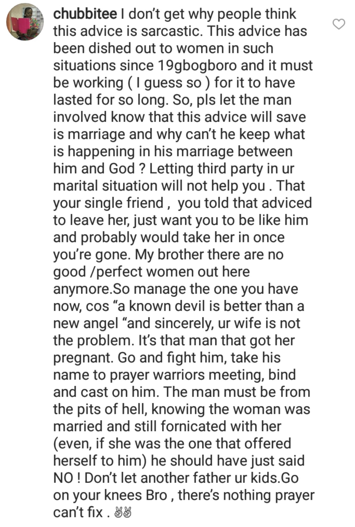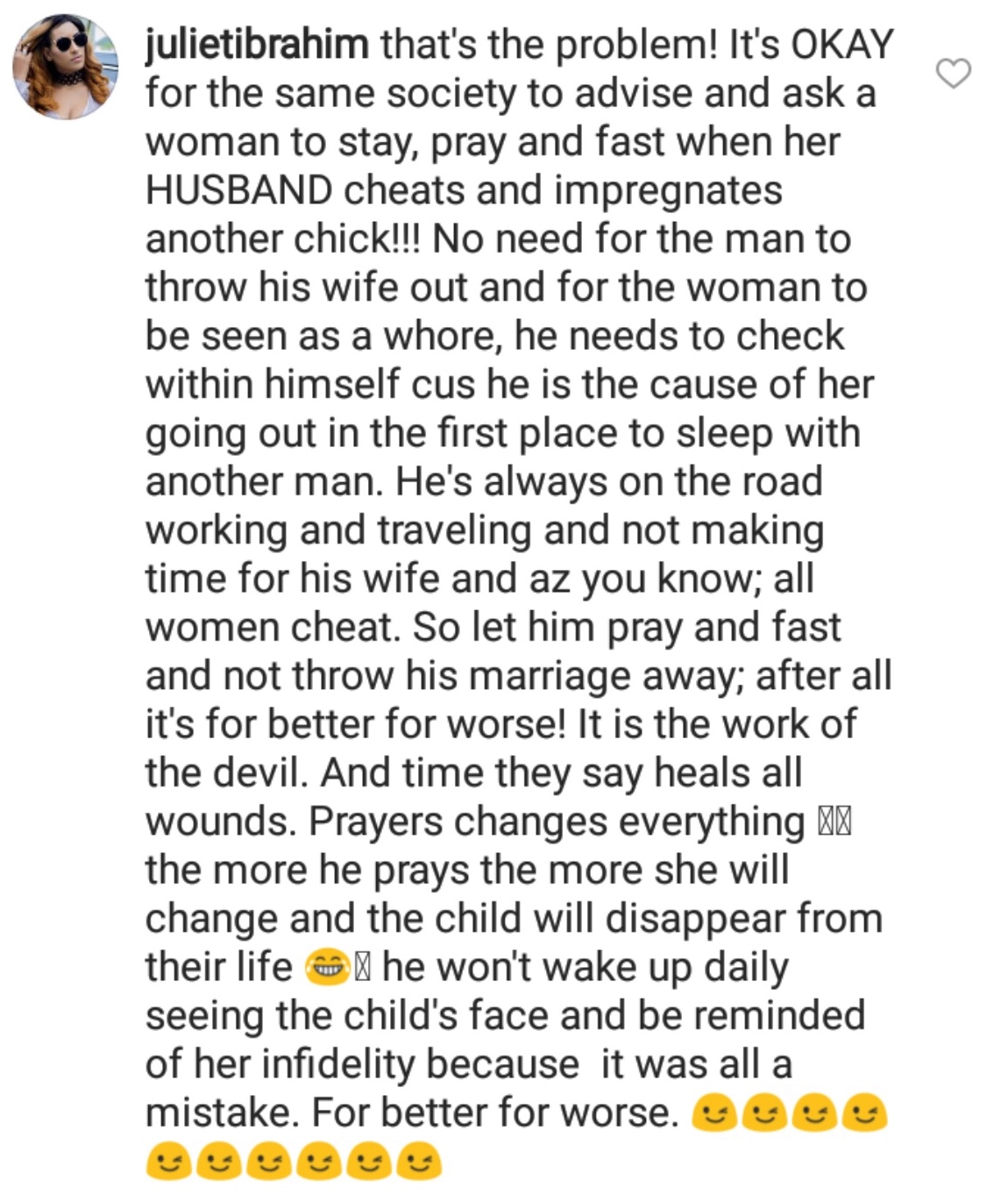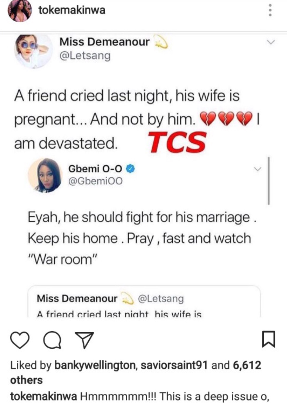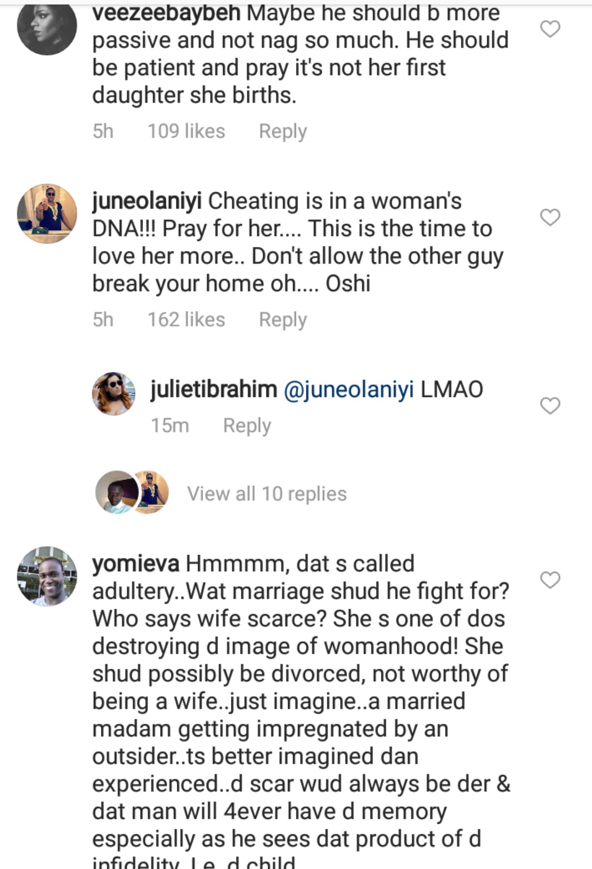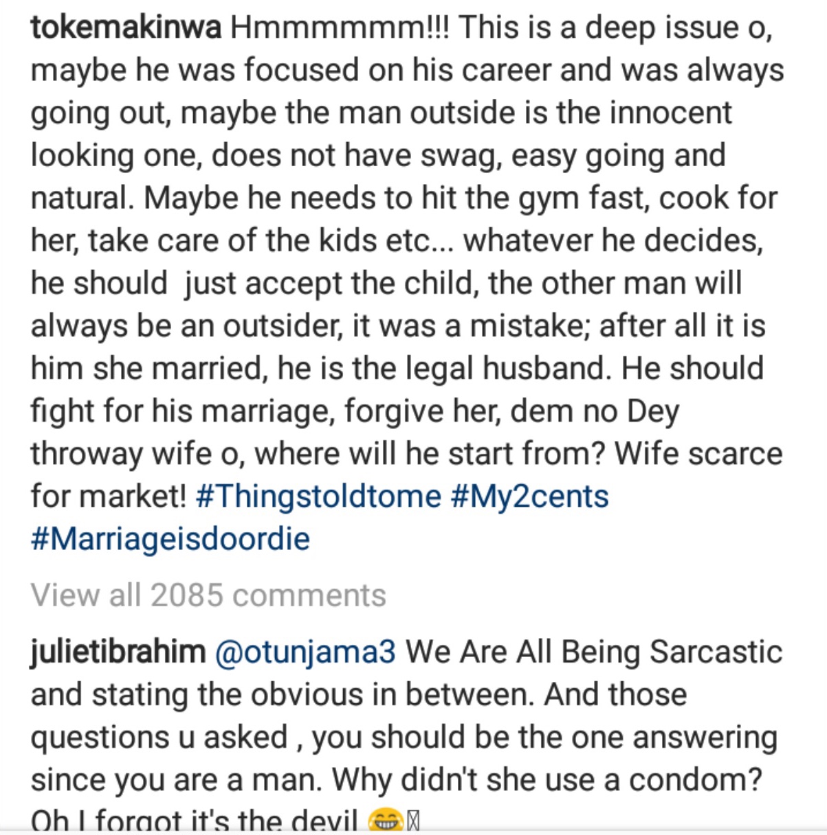 The debate was about the cheating woman who got pregnant and the reaction of the husband. This was the hott topic and Toke Makinwa insinuated that a woman going outside to get pregnant is the fault of the man, for not giving her enough attention! – see the comments below: