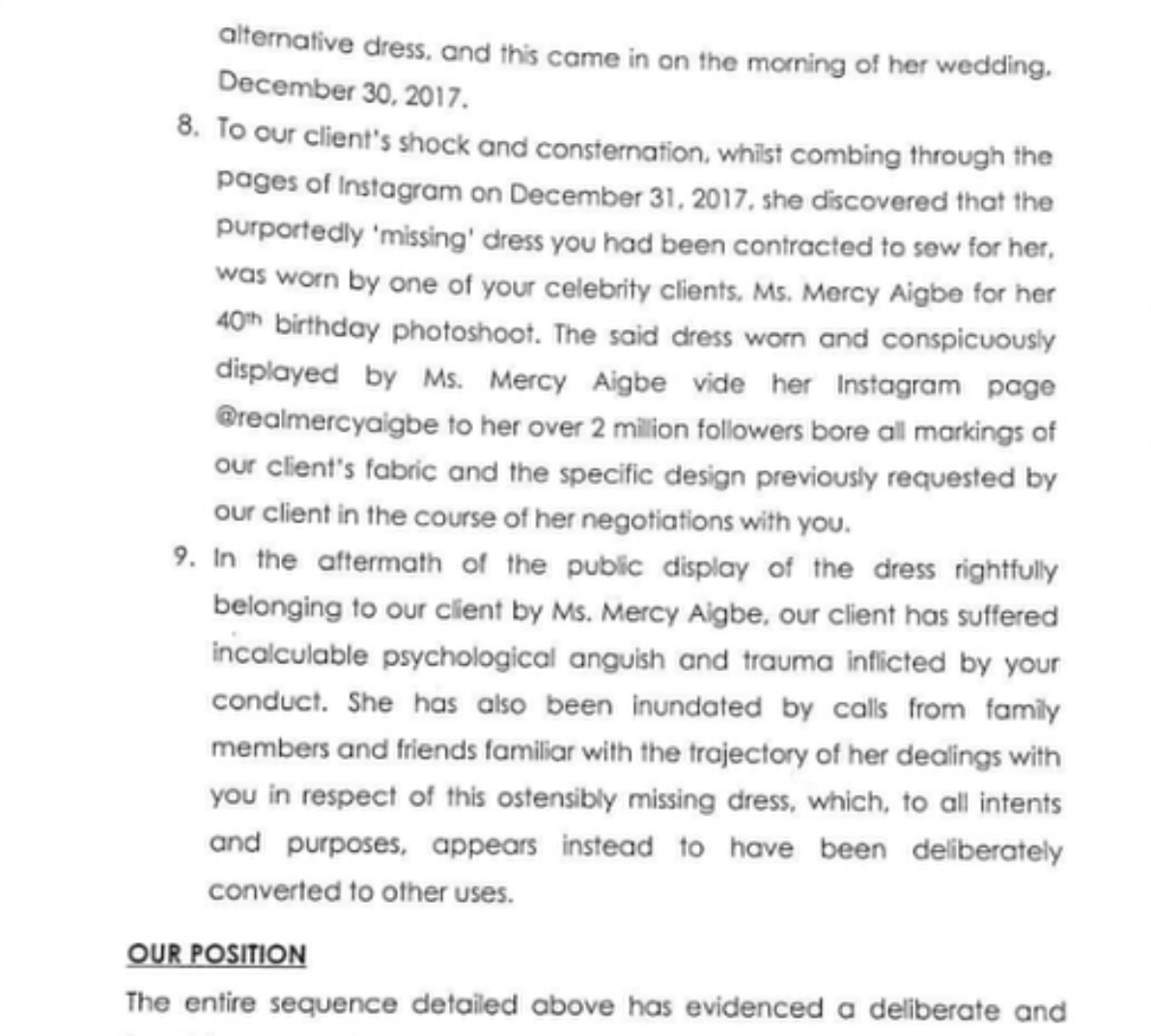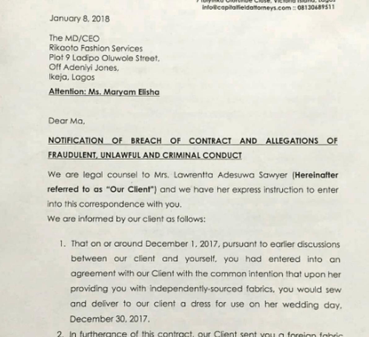 An aggrieved bride, Lawrentta Adesuwa Sawyer, broke the Nigerian social media sphere on January 1st this year, when she called out designer, Maryam Elisha of Rikato by Me, for giving her wedding reception dress to actress Mercy Aigbe to use for her 40th birthday photoshoot.