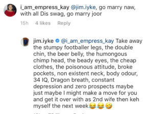 Nollywood actor Jim Iyke, is a man that doesn’t mince his words, so when two followers took it upon themselves to leave unnecessary and unpleasant messages, he had every right to reply however he saw fit, in his case he choose to blast them. See below what the followers said and Jim’s response: