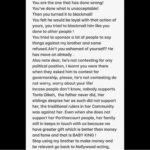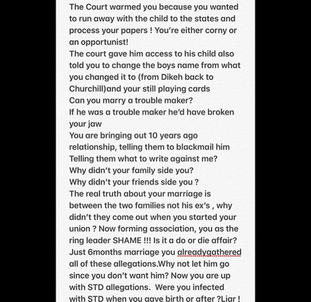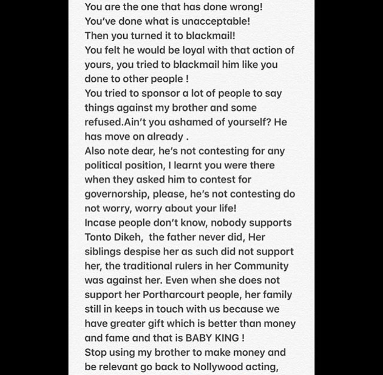 What exactly is your gain ? Are you trying to scare young girls off marriage because of your hidden agenda? You are saying my brother squatted with you ? How? How many houses has he got to be squatting? I’m very ashamed of you!! Have you bought a land in your village before you met him ?What do you have ? You’d be deceiving people speaking in rubbish tongue! Running after small boys and all the 70 years old sugar daddies. Please note that the wives of the old men are complaining for Christ sake.Lady, my brother has been balling long before you dreamt of coming to Lagos from your village. We do not boast but we are from a very comfortable background,We are not children of a Gardener like you said to put dirt on our family name. You serial blackmailer, he is not contesting for any election, so leave him the hell alone! I remember how you broke my moms house you and bit my arm I ignored it ! I should have slapped the devil out of you ! Madam, just leave us the hell alone ! WE DO NOT WANT TO BE ATTACHED TO YOU! This man did not touch you neither did he push but you lied because you feel you are a celebrity ! Celebrity my ass with no income !