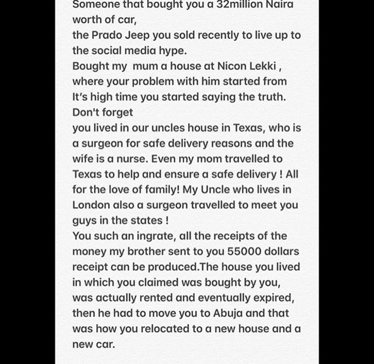 I vividly recollect the day I met you on my birthday with your friend while we were celebrating the Benz’s my brother bought. Even at that period we met you, you were in a messy debt, embarrassingly owning your online shopper some money, so bad that you had no money to pay and you had to burn her bag and shoes. It was that same period you told my brother about the debt and followed him to Ghana and he left me in Nigeria even though I came all the way from London. Regardless of your bad reputation, someone was still proud of you.