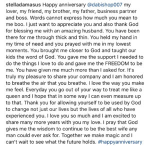Nollywood actress, Stella Damasus, and her husband are celebrating their wedding anniversary. She took to her social media account to share a video and message, check them out below: